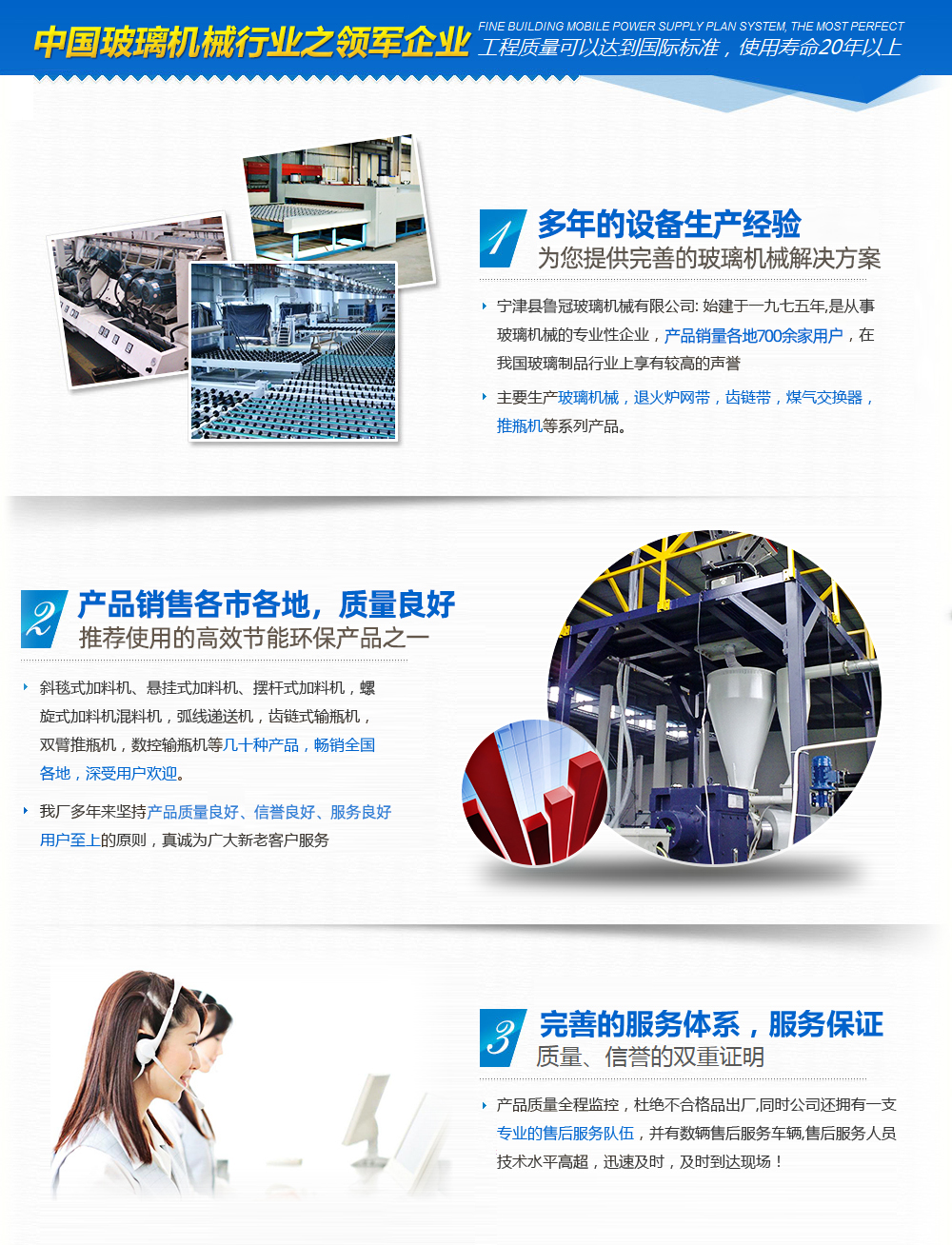 山東魯冠玻璃機械有限公司,是從事玻璃機械的專注性企業,產品行銷各地700余家用戶,在我國玻璃制品行業上享有較高的聲譽。目前主要生產玻璃加料機,玻璃混料機,煤氣交換器,玻璃原料自動配料等玻璃機械設備。此外,我公司具備良好的整體素質和渾厚的技術力量,制造工藝完善,設備完善,具備完善的質量管理和質量檢測體系。企業堅持“科學技術是主要生產力”的主導思想,不斷加強新產品研發力度,玻璃機械產品的開發生產,為適應玻璃制品行業發展需要,相繼先后研制出:斜毯式加料機、懸掛式加料機、強制式混合機等幾十種產品,銷售各地,深受用戶歡迎。 我公司產品已實現:網帶鏈條、玻璃機械、輸送機械、玻璃原料自動混配、食品機械五大系列。我公司多年來堅持“用戶至上”的原則,真誠為廣大新老客戶服務,竭誠歡迎廣大新老客戶光臨惠顧!